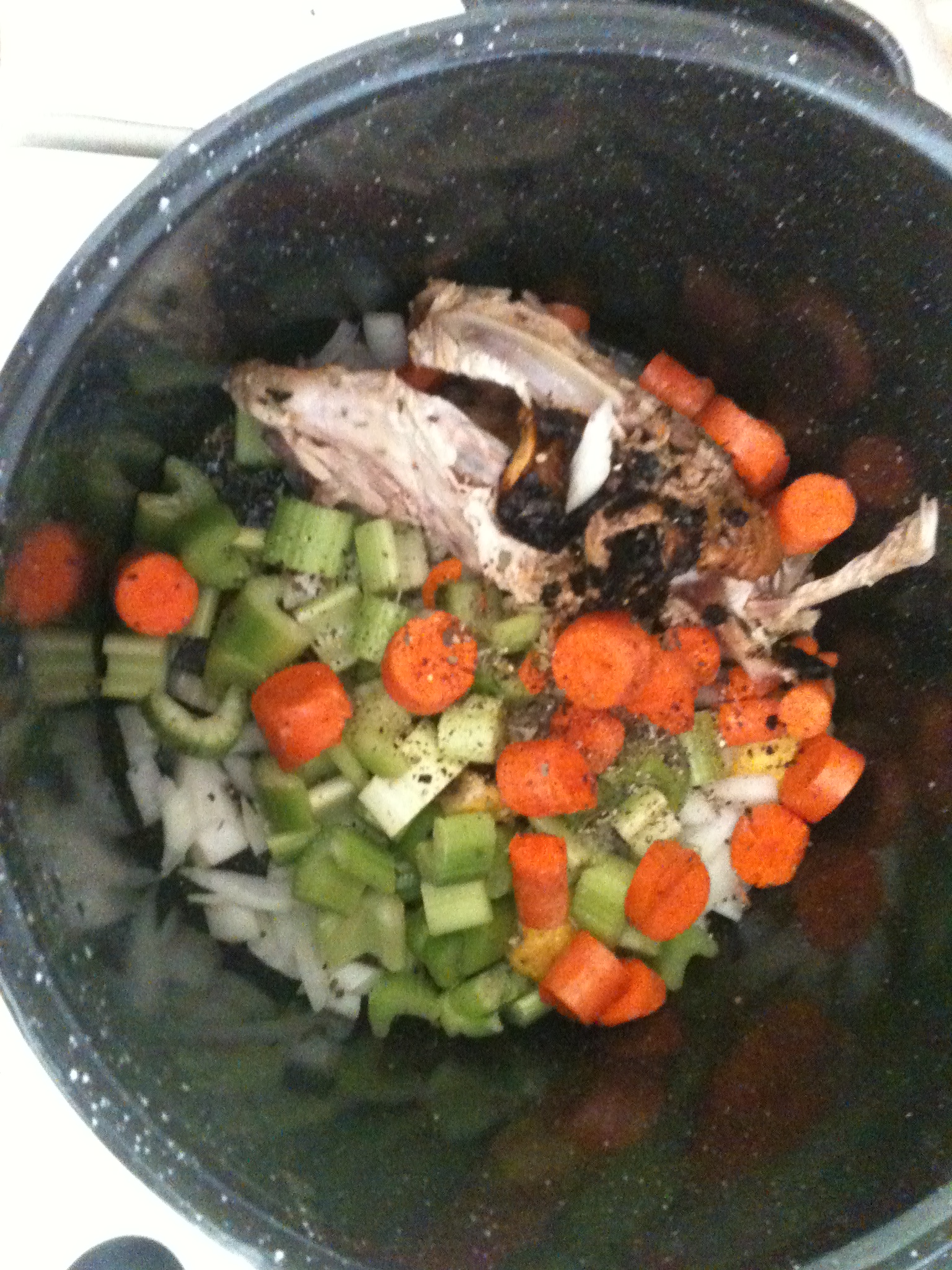 - Cook water, onions, carrot, and garlic in a large pot over low heat for 10 minutes, until wilted.